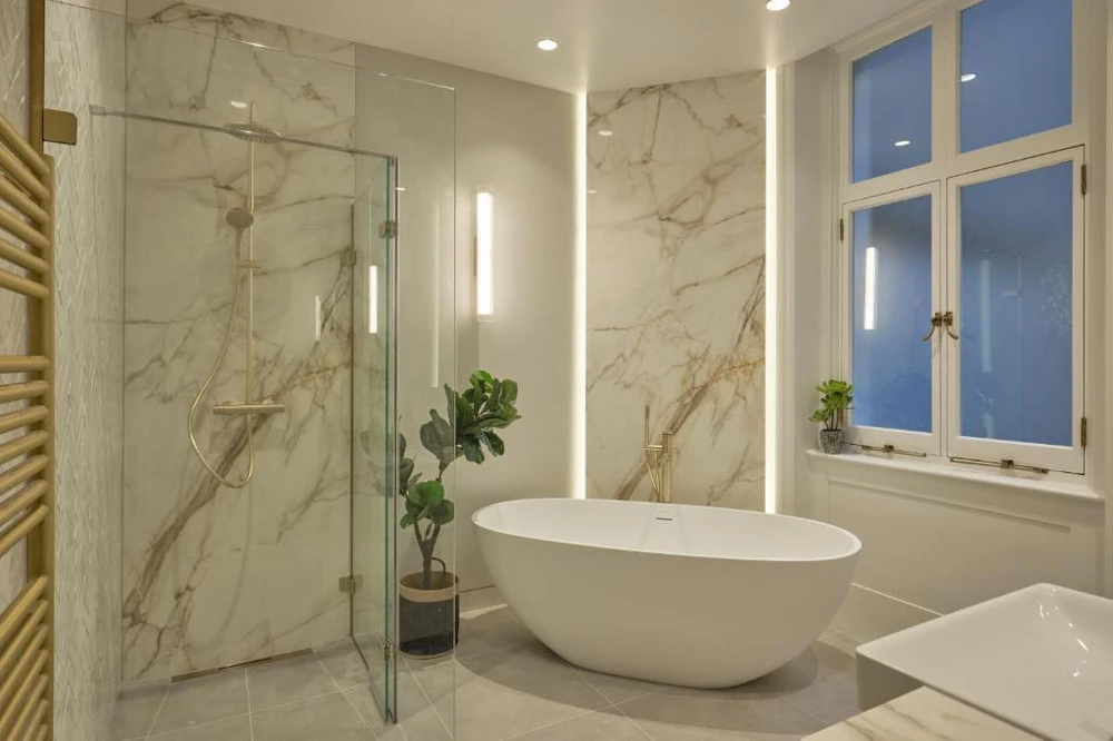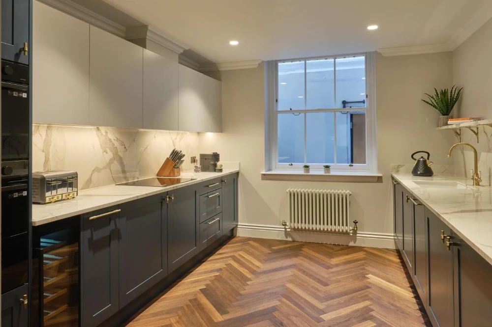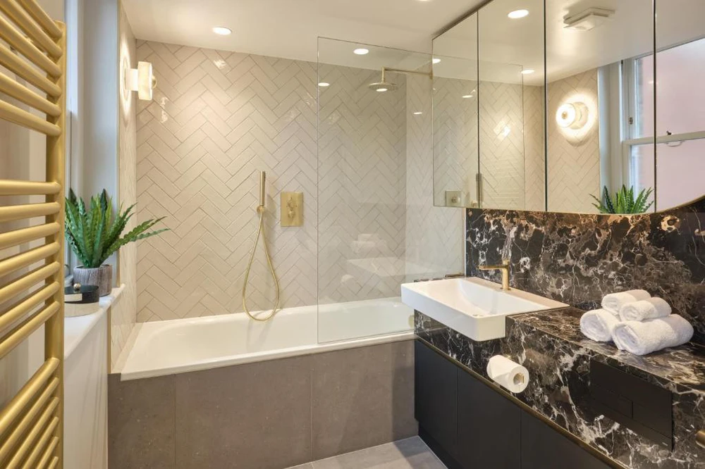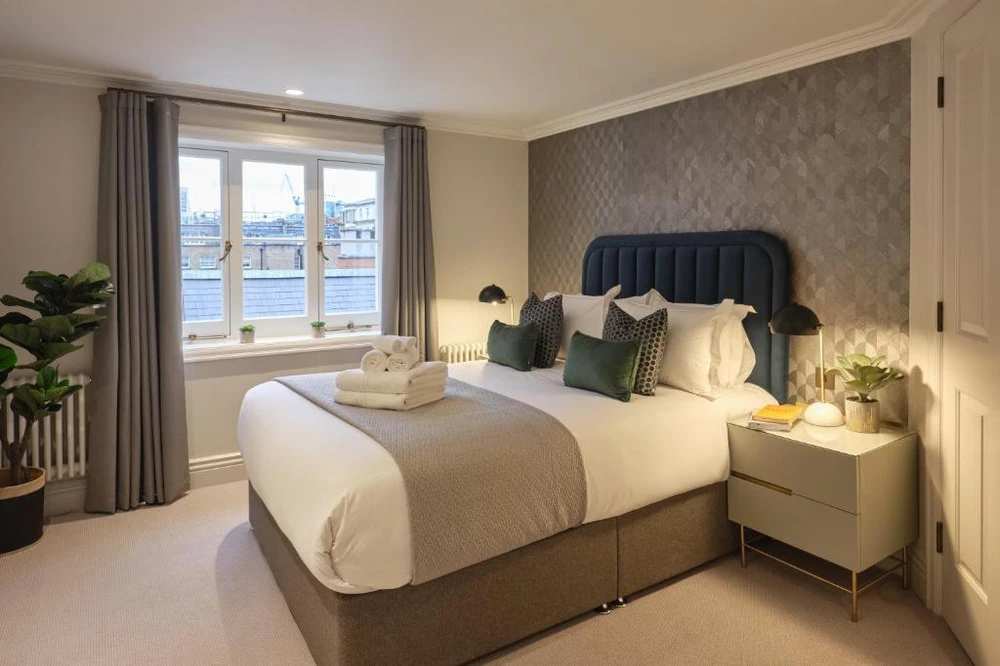 Spacious bedrooms are beautifully finished with carpeted flooring, top-range mattresses, and built-in wardrobes with ample storage. Bathrooms are modern and pristine, featuring stunning herringbone tiling, brushed-brass fittings, and either a bath with shower overhead or a walk-in shower.–Enhanced luxury servicing included–Enhanced services at this property ensure a five-star stay, with an on-site concierge and 24-hour guest services to provide support, a personal safe in every apartment, weekly servicing and complimentary Wi-Fi included as standard.