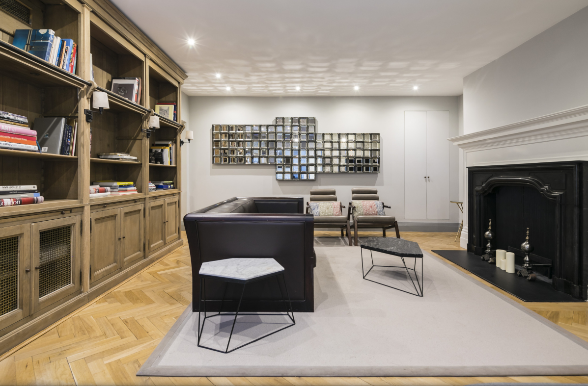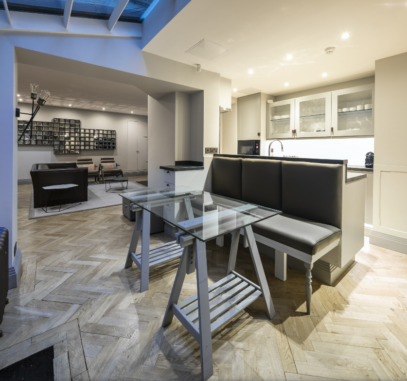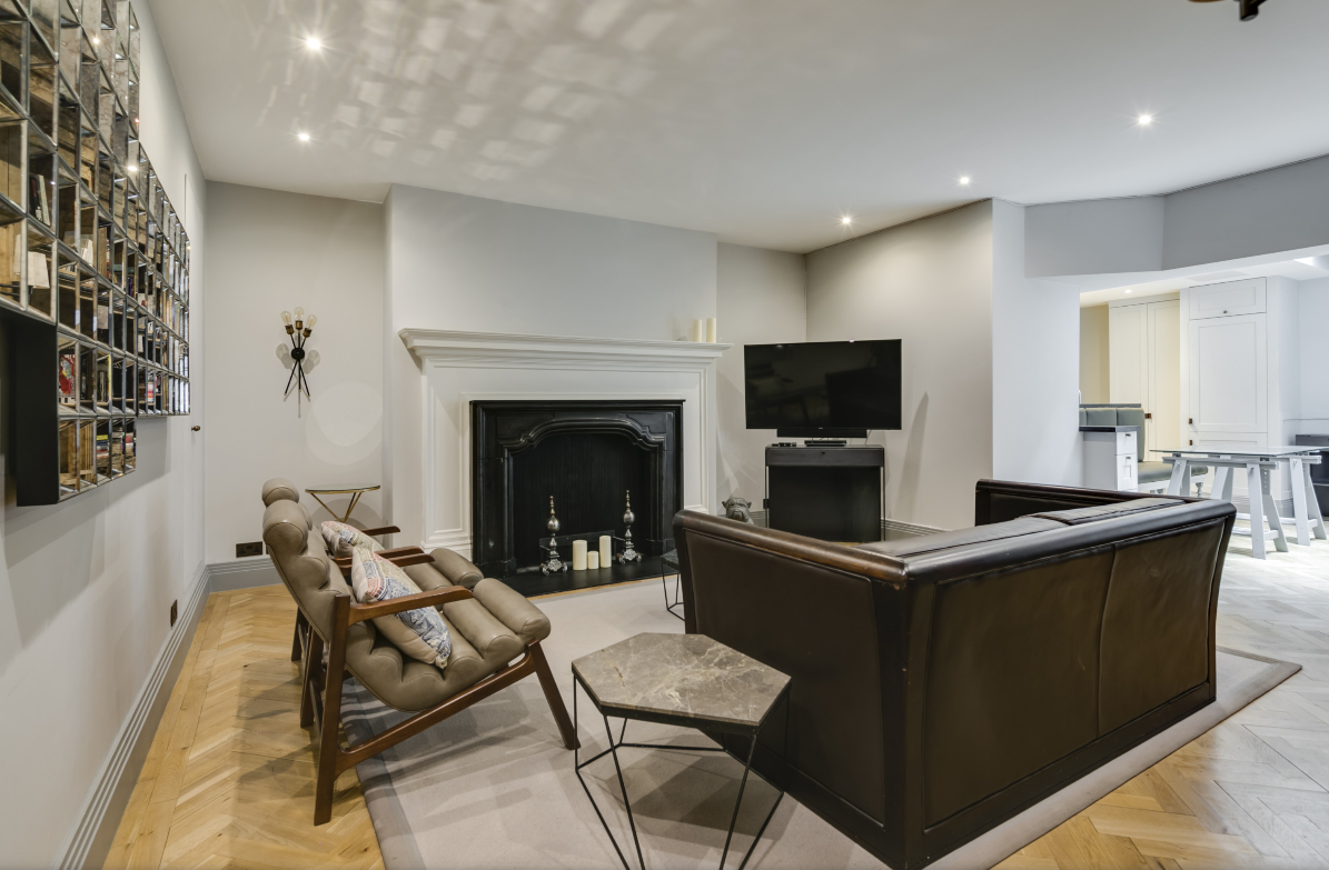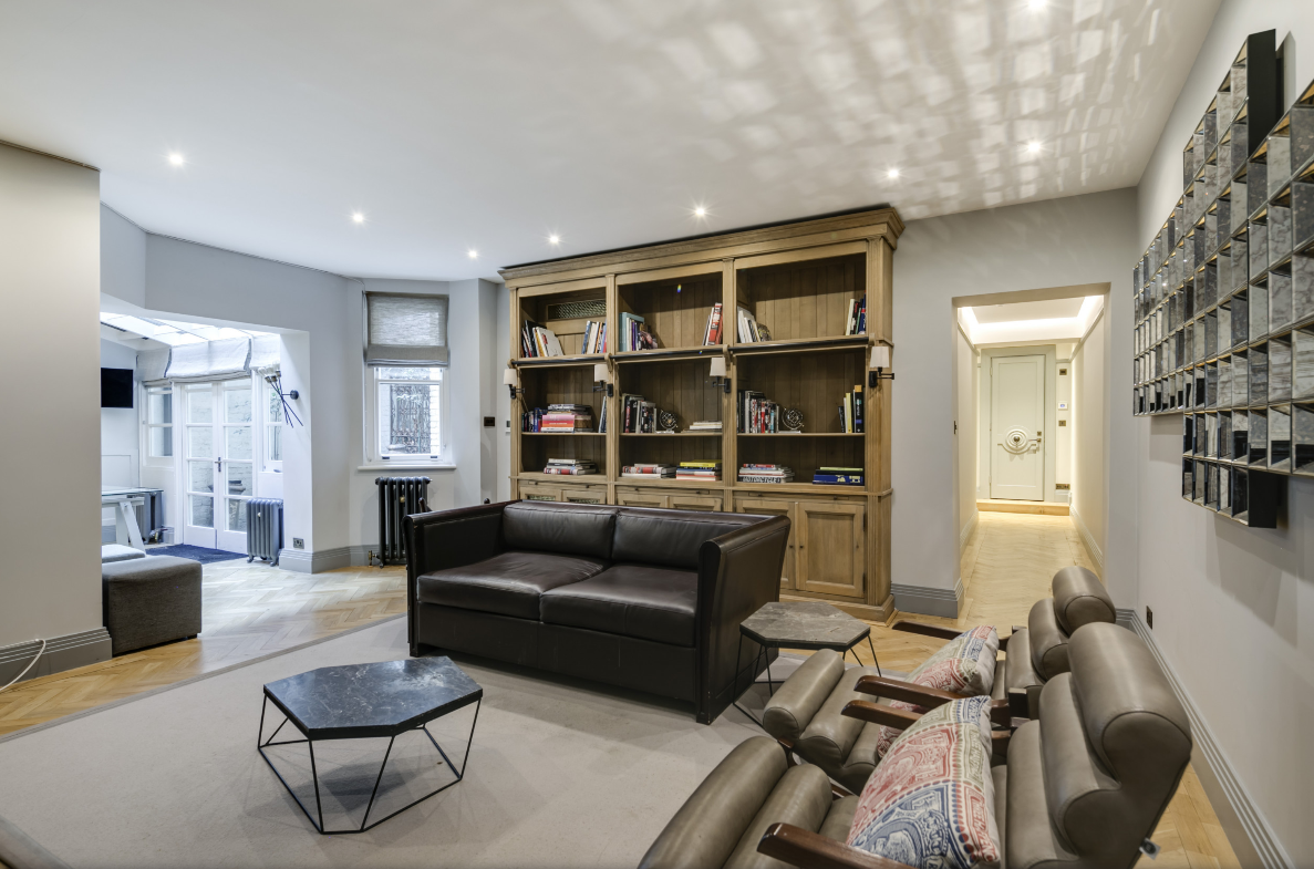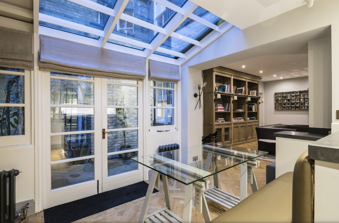 Welcome to The Hannover Suite, a luxury one-bedroom apartment in Central London, nestled near the bustling Oxford Street. This premium serviced apartment is a true gem, located on the lower ground-basement level towards the rear of the building, offering a serene escape in the heart of the city. The apartment showcases a large, light-filled living space adorned with an antique bookcase and an ornamental fireplace, creating a blend of elegance and comfort. Sunlight streams in through the conservatory, leading to a patio that extends from the fully fitted kitchen, equipped with modern conveniences such as a fridge/freezer, dishwasher, and coffee machine. The dining area, perfect for four, adds to the apartment’s charm.