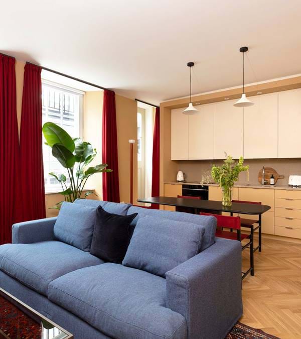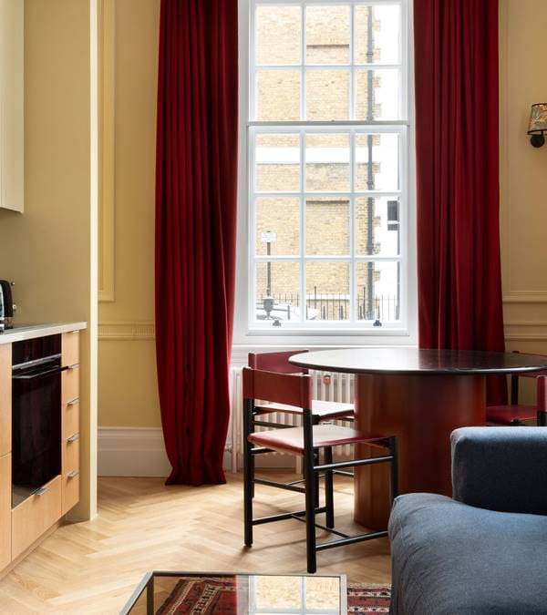 65 Harley St is a collection of 10 luxury serviced apartments set in a historic Grade II Listed building designed by Claude Ferrier, and lovingly restored by Barbara Weiss Architects. The interiors of the 1 and 2 bedroom apartments reflect a blend of diverse aesthetics, periods, and colours to create stylish, comfortable, and inviting living spaces. The apartments feature antique Persian rugs, tweed-covered sofas, and a mix of contemporary elements, all designed by Waldo Works to evoke a sense of elegant relaxation.