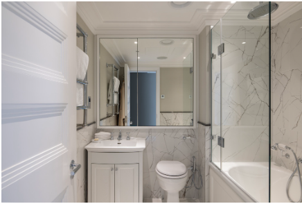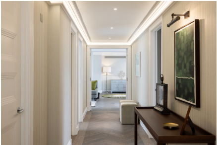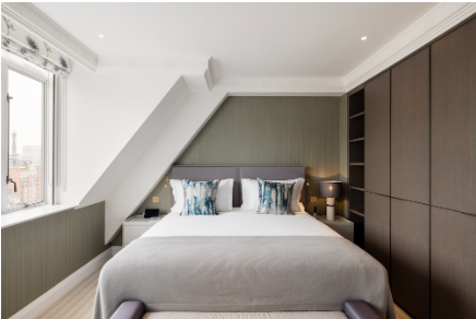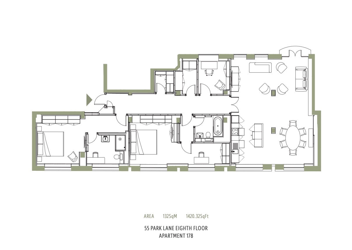 Step into apartment 178a at 55 Park Lane, a gorgeous two bedroom ensuite apartment styled in our English country house design where traditional meets modern. Antique pieces are placed alongside luscious sofas and rustic details, creating an atmosphere of homely calm. Taking inspiration from Hyde Park and the outdoors, this tranquil apartment is furnished in dappled shades of sage, pine, plum and heather. At its heart is the open plan living and kitchen space with Juliet balconies designed to bring you and your loved ones together whether you are cooking, eating, relaxing or working. The private study room and a dressing room off the second bedroom complete this special apartment. Fabrics by Jean Monro call to mind the beauty of a walled garden, with hand blocked patterns reminiscent of wisteria, hollyhock and thistle. Pretty botanical prints carry this theme across the soft white walls. Classic and comforting, it offers everything you need to feel truly at home.